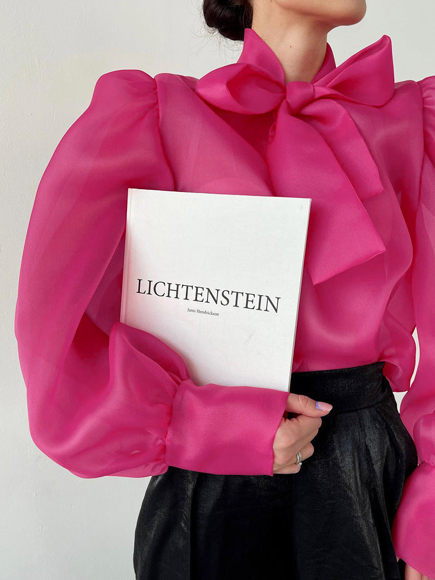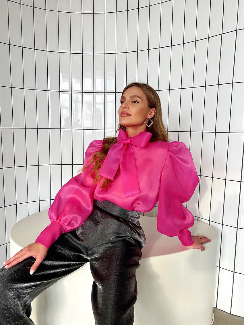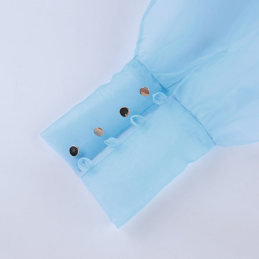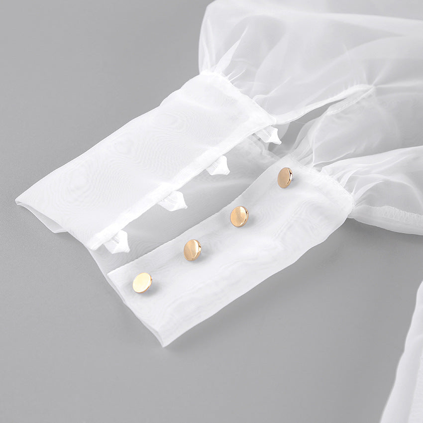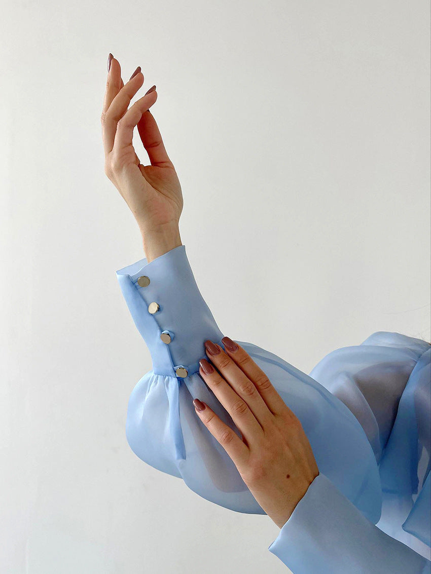 Blusa Clarice toda em organza com detalhes dourados no pulso.