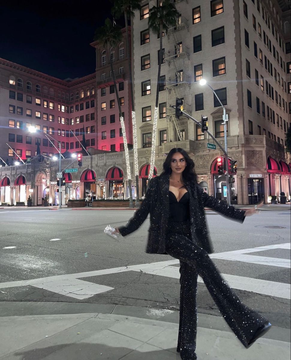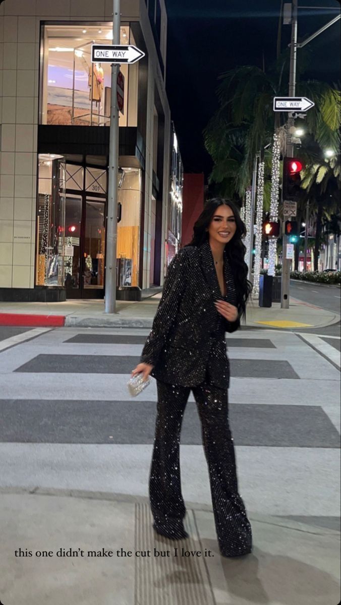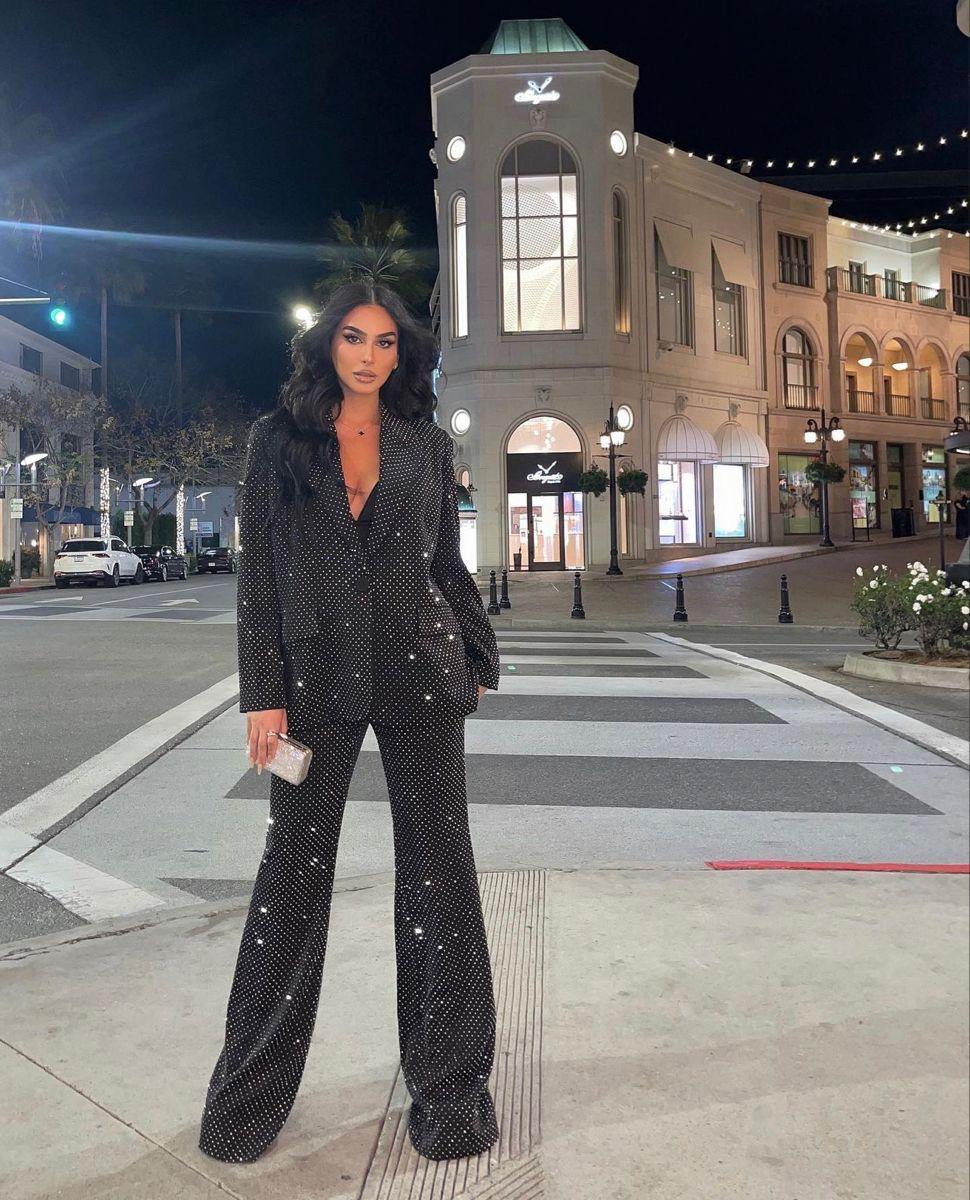 Este conjunto de três peças é uma elegante opção de alfaiataria composto por um top, blazer e calça. Todas as peças são adornadas com um brilho sutil que adiciona um toque de sofisticação. O top apresenta um decote em "V" com alças retas, enquanto o blazer possui um fecho frontal em botão, decote em "V" e ombreiras levemente estruturadas, além de detalhes frontais em bolsos falsos.